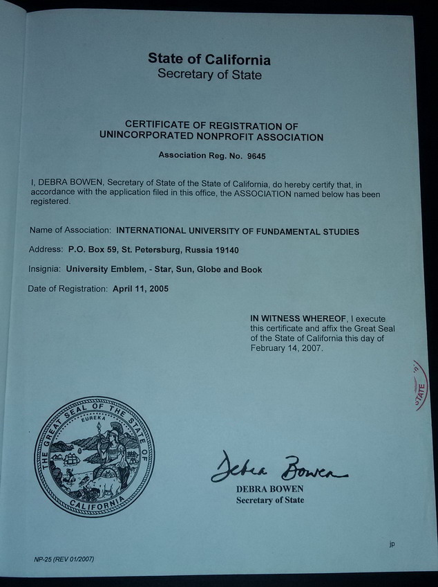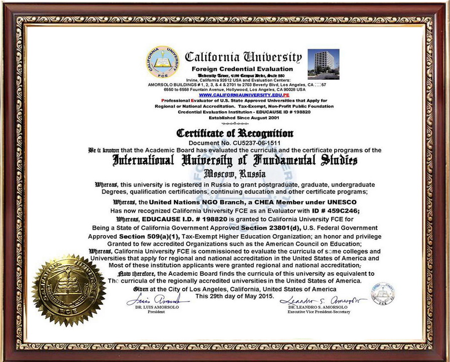 In 2005 California University FEC recognized IUFS degrees in USA and issued a Certificate of Recognition and in 2015 resumed the Certificate after IUFS moved to Moscow. Finnaly IUFS accepting by the State Department of USA.